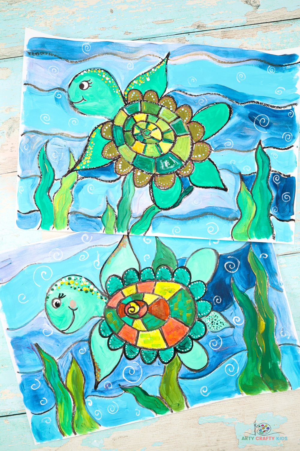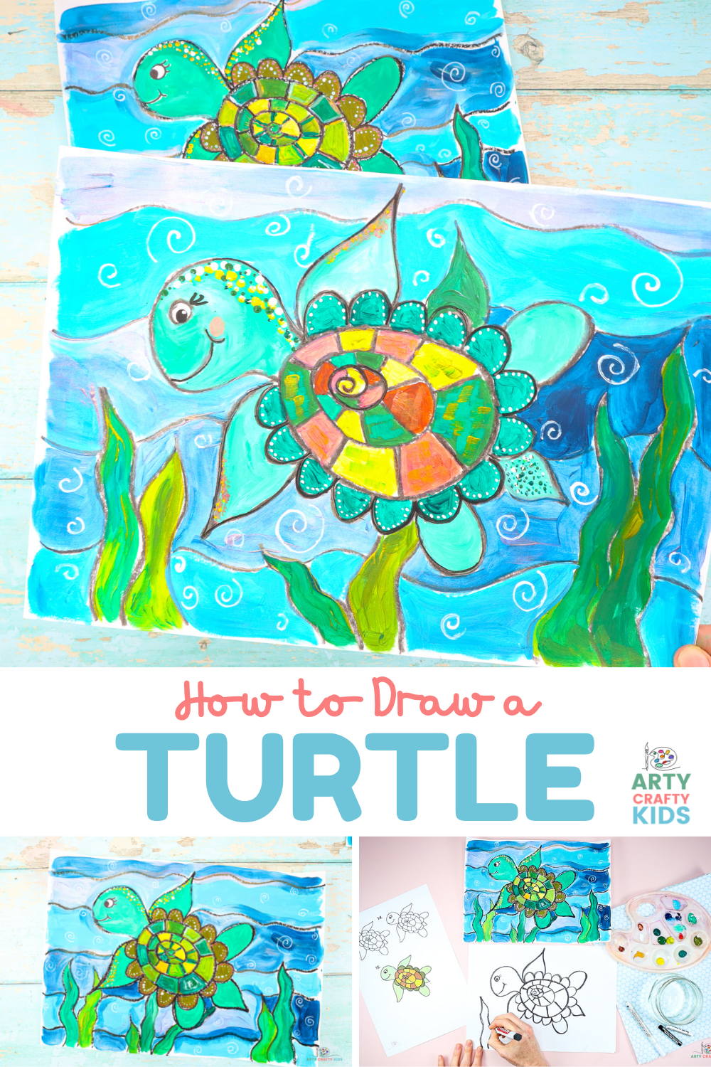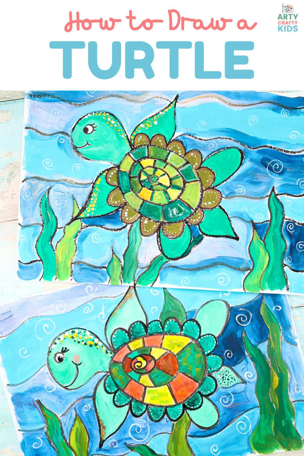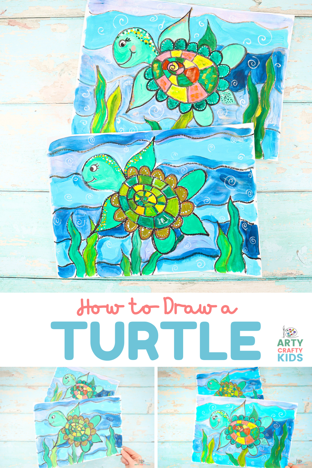 Our how to draw a turtle lesson uses paint to color the completed design. Arty Crafty Kids may also use paint, try new mediums or stick to their favorites!